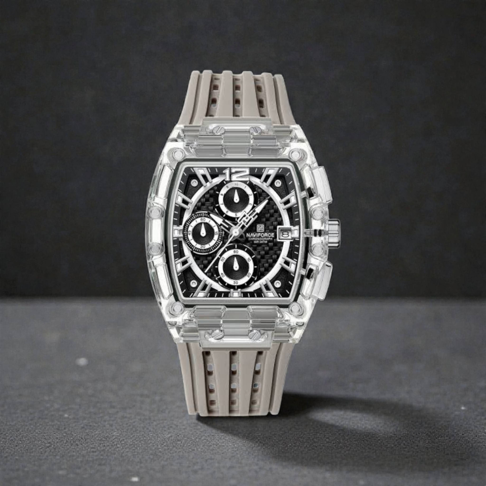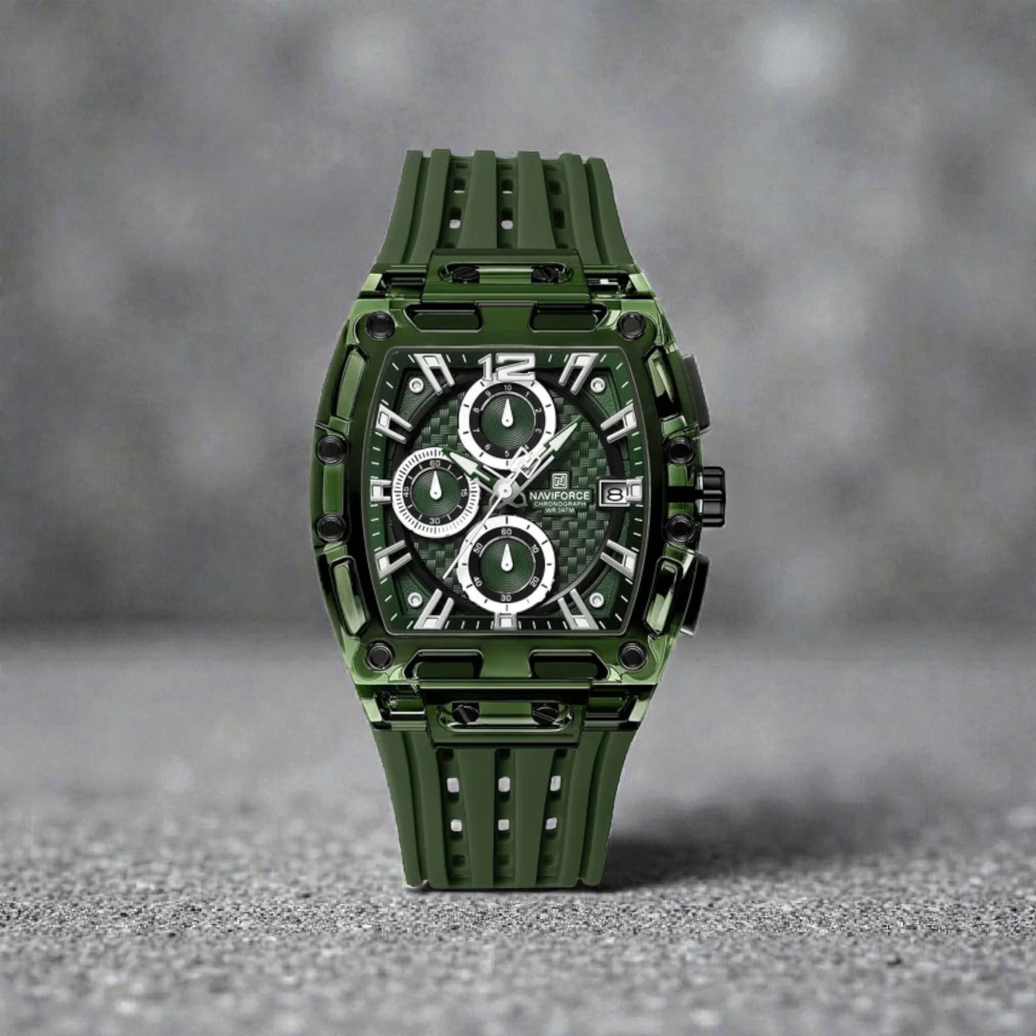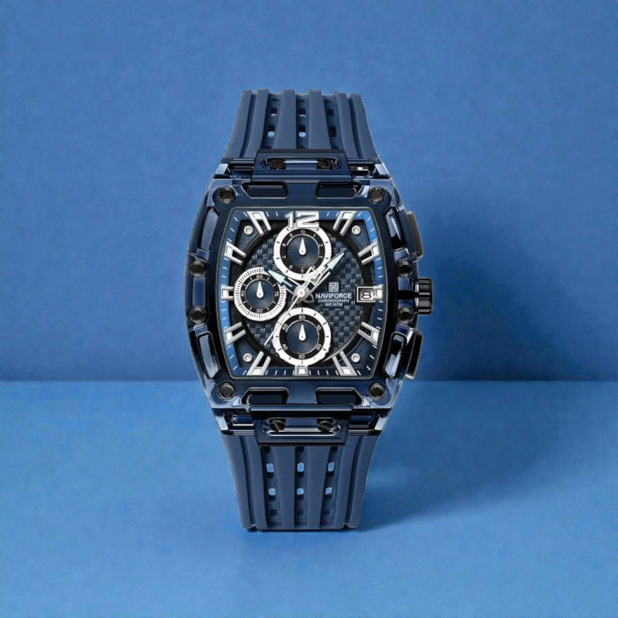 Naviforce NF8053 Men’s Chronograph watch engineered with an industrial-grade, armor-inspired case featuring a distinctive nut design, this watch exudes robustness.—an embodiment of strength and style. Its 3D dial offers a captivating view of sophisticated work, enhanced by multi-function sub-dials for 24 hours, minutes, and seconds. The dual-time functionality—is a perfect companion for frequent travelers. Crafted for comfort, the ergonomically designed retro barrel-shaped case fits snugly on the wrist. Luminous markers ensure clear visibility in low-light conditions, while the supple genuine leather strap provides both luxury and adjustability. Naviforce’s commitment to quality shines through in the choice of premium materials, ensuring durability and a superior wearing experience. With a 3ATM water resistance rating, the NF8053 confidently handles everyday splashes. Its lightweight alloy casing offers durability without compromising comfort, suitable for any occasion. Available in a variety of vibrant colors, this watch effortlessly suits different personal styles. Naviforce NF8053 will be a hot sale product in your shop, contact now for more info.